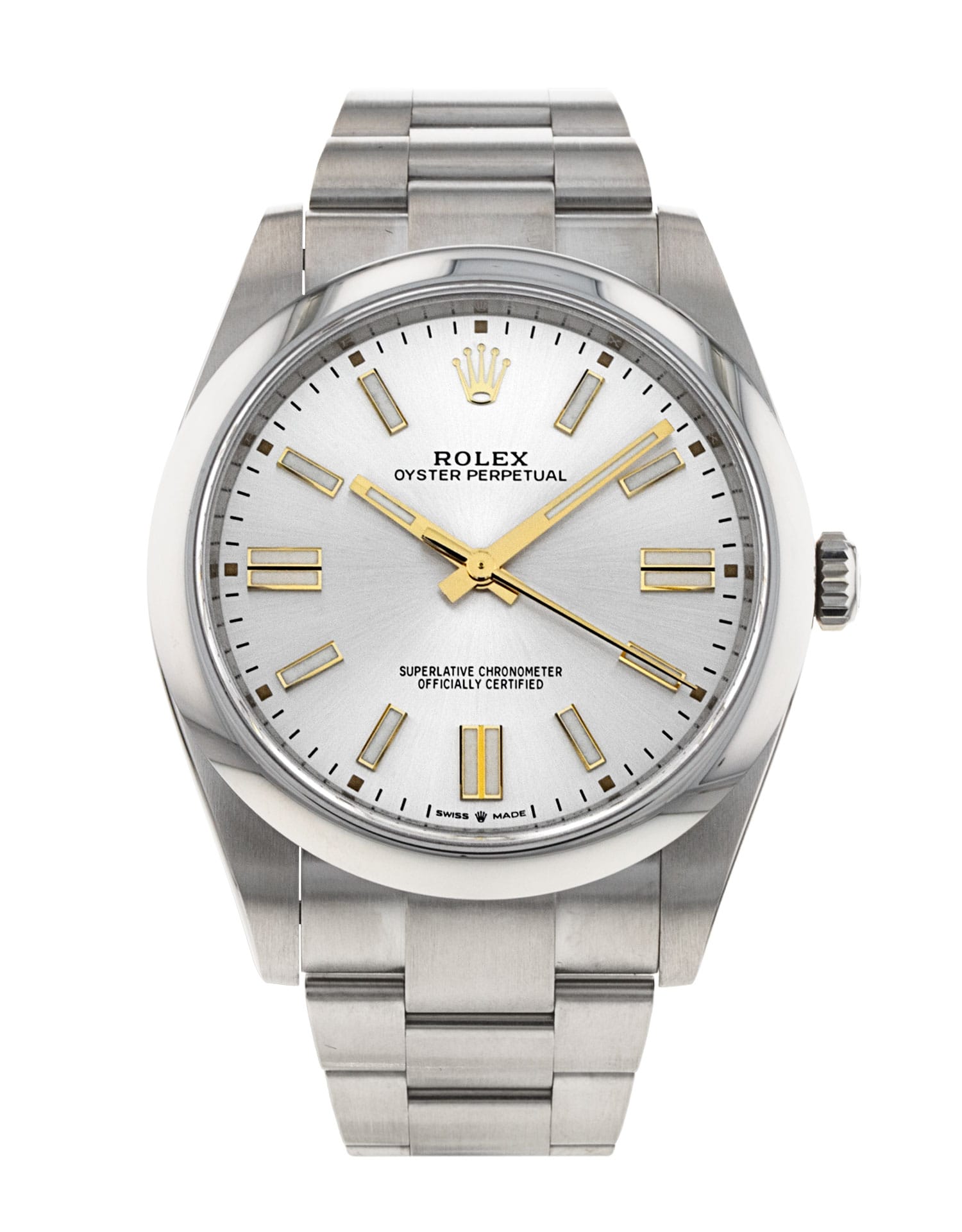 This Rolex Oyster Perpetual 124300 has a silver baton dial and a bracelet strap. This Rolex has undergone a thorough inspection of water resistance, accuracy, functionality and condition to determine the level of reconditioning required to meet our strict standards. It has also been referenced against technical documents and manufacturer records where available to ensure authenticity and a clean history. All our watches have a 24-month warranty for your peace of mind. One of our skilled polishing technicians has removed marks on the case and bracelet of this watch, brought about by daily wear and tear, which is why this watch does not come with the remaining manufacturer’s warranty.