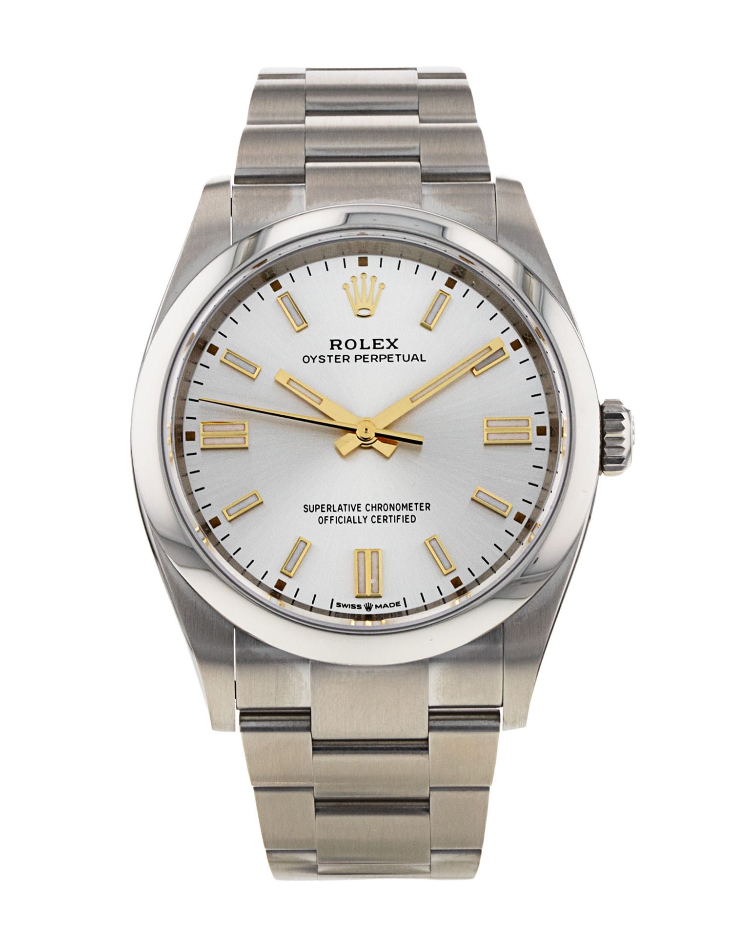 This Rolex Oyster Perpetual 126000 has a silver baton dial and a bracelet strap. This Rolex has undergone a thorough inspection of water resistance, accuracy, functionality and condition to determine the level of reconditioning required to meet our strict standards. It has also been referenced against technical documents and manufacturer records where available to ensure authenticity and a clean history. Our watches have a 24-month warranty for your peace of mind, in conjunction with any remaining manufacturer’s warranty from new or from service. To maintain the manufacturer’s warranty on this watch, it has not been polished in our service centre.