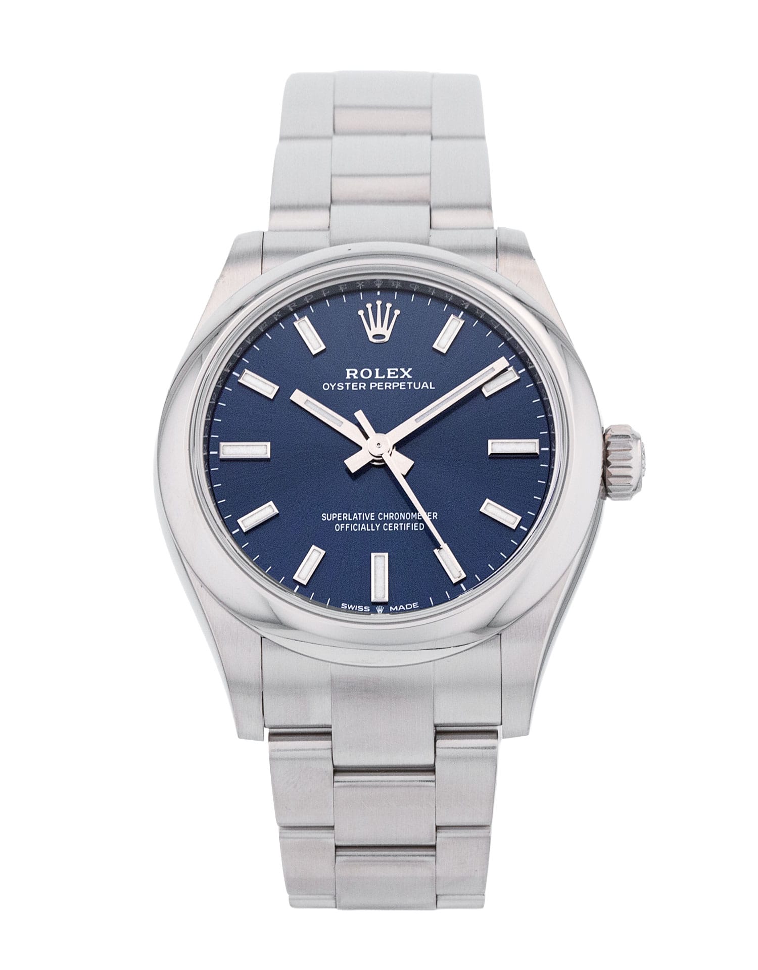 This Rolex Oyster Perpetual 277200 has a blue baton dial and a bracelet strap. This Rolex has undergone a thorough inspection of water resistance, accuracy, functionality and condition to determine the level of reconditioning required to meet our strict standards. It has also been referenced against technical documents and manufacturer records where available to ensure authenticity and a clean history. Our watches have a 24-month warranty for your peace of mind, in conjunction with any remaining manufacturer’s warranty from new or from service. To maintain the manufacturer’s warranty on this watch, it has not been polished in our service centre.