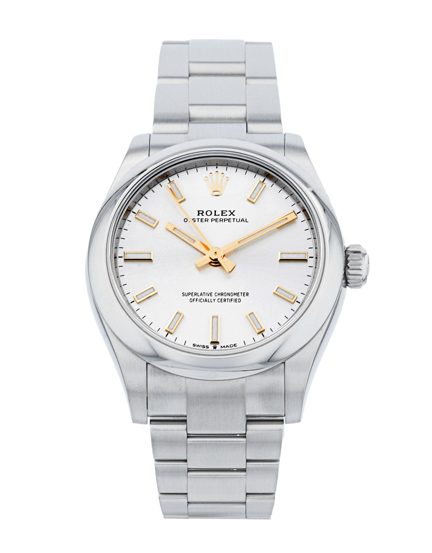 This Rolex Oyster Perpetual 277200 has a silver baton dial and a bracelet strap. This Rolex has undergone a thorough inspection of water resistance, accuracy, functionality and condition to determine the level of reconditioning required to meet our strict standards. It has also been referenced against technical documents and manufacturer records where available to ensure authenticity and a clean history. Our watches have a 24-month warranty for your peace of mind, in conjunction with any remaining manufacturer’s warranty from new or from service. To maintain the manufacturer’s warranty on this watch, it has not been polished in our service centre.