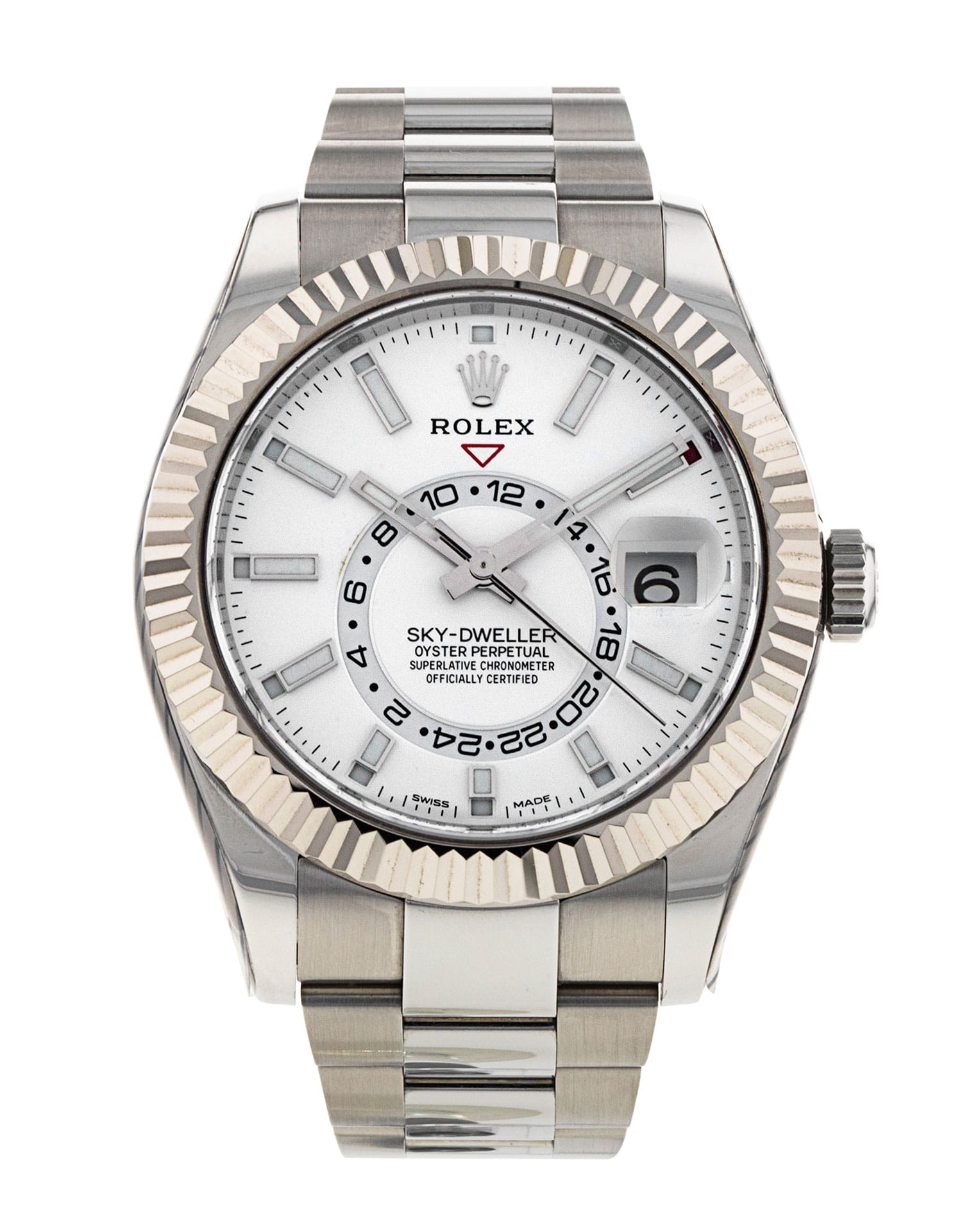 This Rolex Sky-Dweller 326934 has a white baton dial and a bracelet strap. This Rolex has undergone a thorough inspection of water resistance, accuracy, functionality and condition to determine the level of reconditioning required to meet our strict standards. It has also been referenced against technical documents and manufacturer records where available to ensure authenticity and a clean history. All our watches have a 24-month warranty for your peace of mind. One of our skilled polishing technicians has removed marks on the case and bracelet of this watch, brought about by daily wear and tear, which is why this watch does not come with the remaining manufacturer’s warranty.