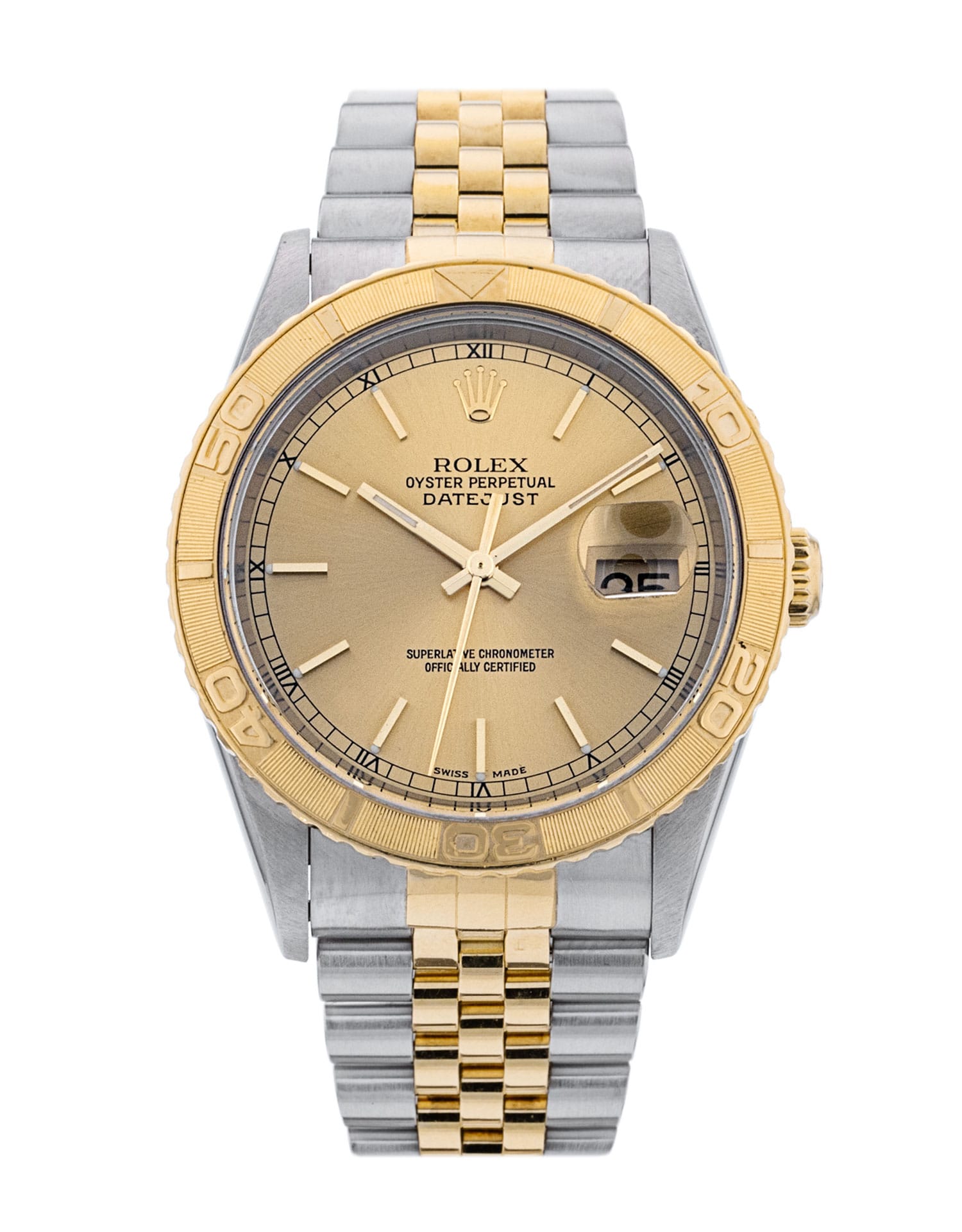 This Rolex Turn-O-Graph 16263 has a champagne baton dial and a bracelet strap. This Rolex has undergone a thorough inspection of water resistance, accuracy, functionality and condition to determine the level of reconditioning required to meet our strict standards. It has also been referenced against technical documents and manufacturer records where available to ensure authenticity and a clean history. All our watches have a 24-month warranty for your peace of mind. One of our skilled polishing technicians has removed marks on the case and bracelet of this watch, brought about by daily wear and tear, which is why this watch does not come with the remaining manufacturer’s warranty.