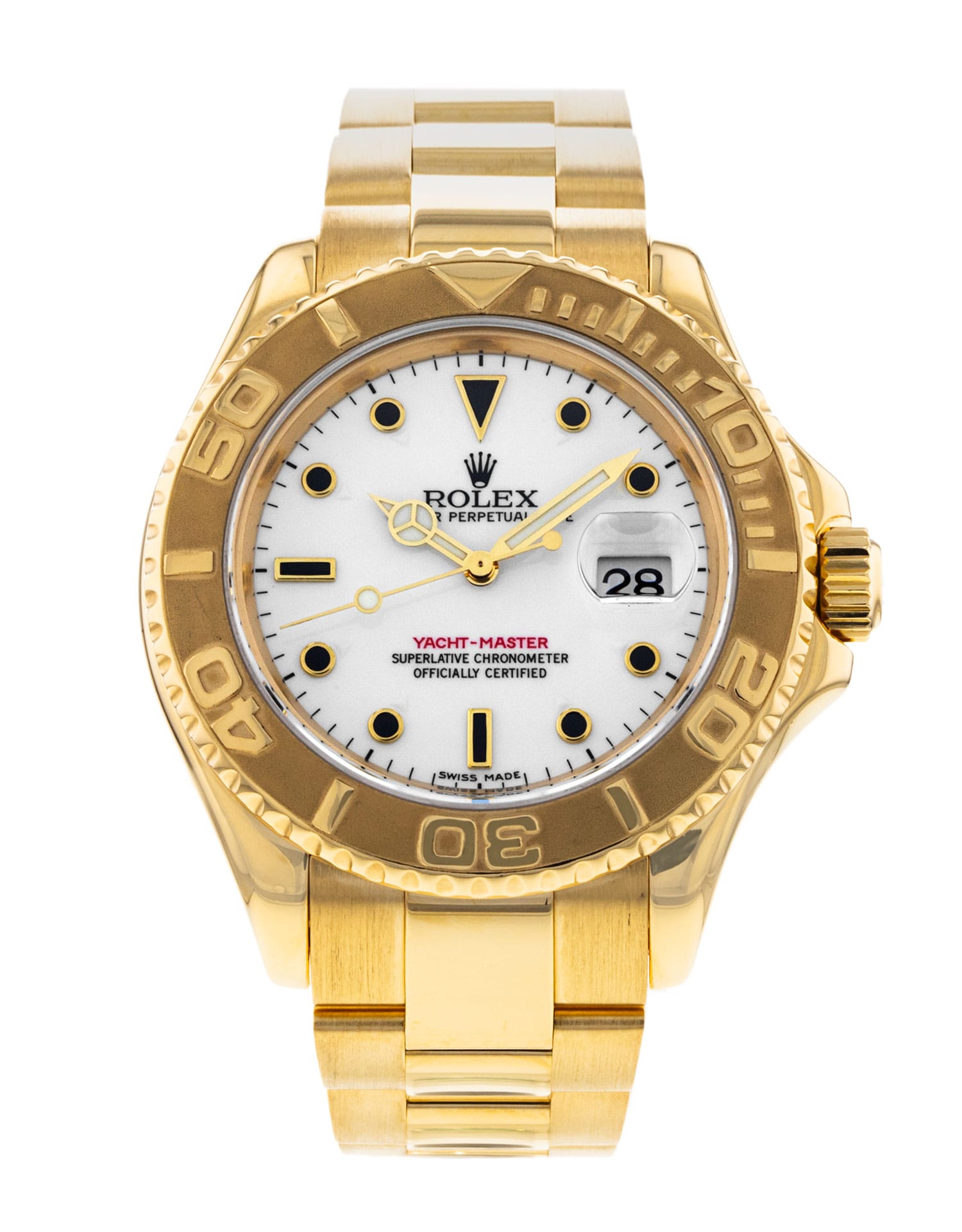 This Rolex Yacht-Master 16628 has a white dial and a bracelet strap. This Rolex has undergone a thorough inspection of water resistance, accuracy, functionality and condition to determine the level of reconditioning required to meet our strict standards. It has also been referenced against technical documents and manufacturer records where available to ensure authenticity and a clean history. All our watches have a 24-month warranty for your peace of mind. One of our skilled polishing technicians has removed marks on the case and bracelet of this watch, brought about by daily wear and tear, which is why this watch does not come with the remaining manufacturer’s warranty.