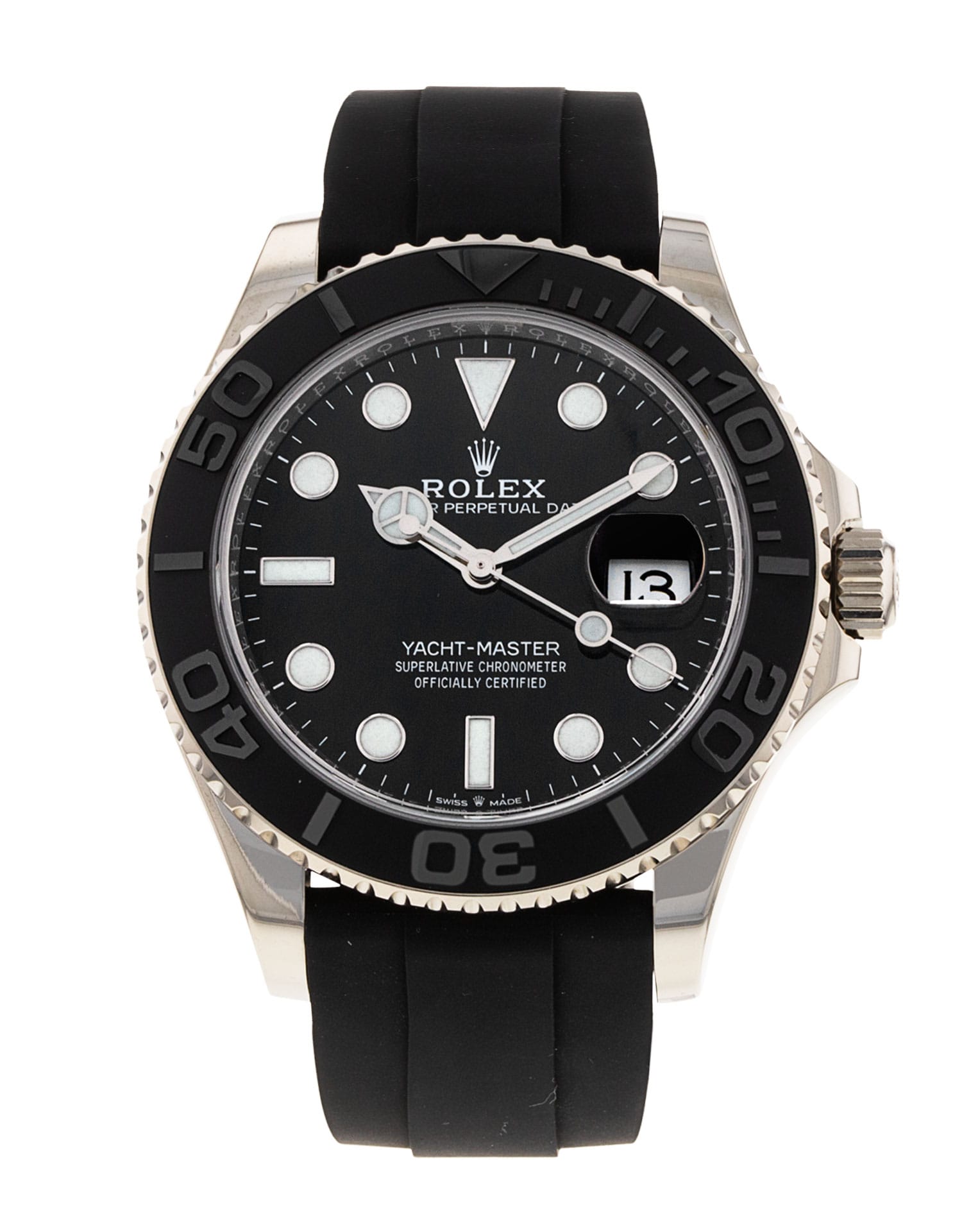 This Rolex Yacht-Master 226659 has a black dial and a rubber strap. This Rolex has undergone a thorough inspection of water resistance, accuracy, functionality and condition to determine the level of reconditioning required to meet our strict standards. It has also been referenced against technical documents and manufacturer records where available to ensure authenticity and a clean history. All our watches have a 24-month warranty for your peace of mind. One of our skilled polishing technicians has removed marks on the case and bracelet of this watch, brought about by daily wear and tear, which is why this watch does not come with the remaining manufacturer’s warranty.