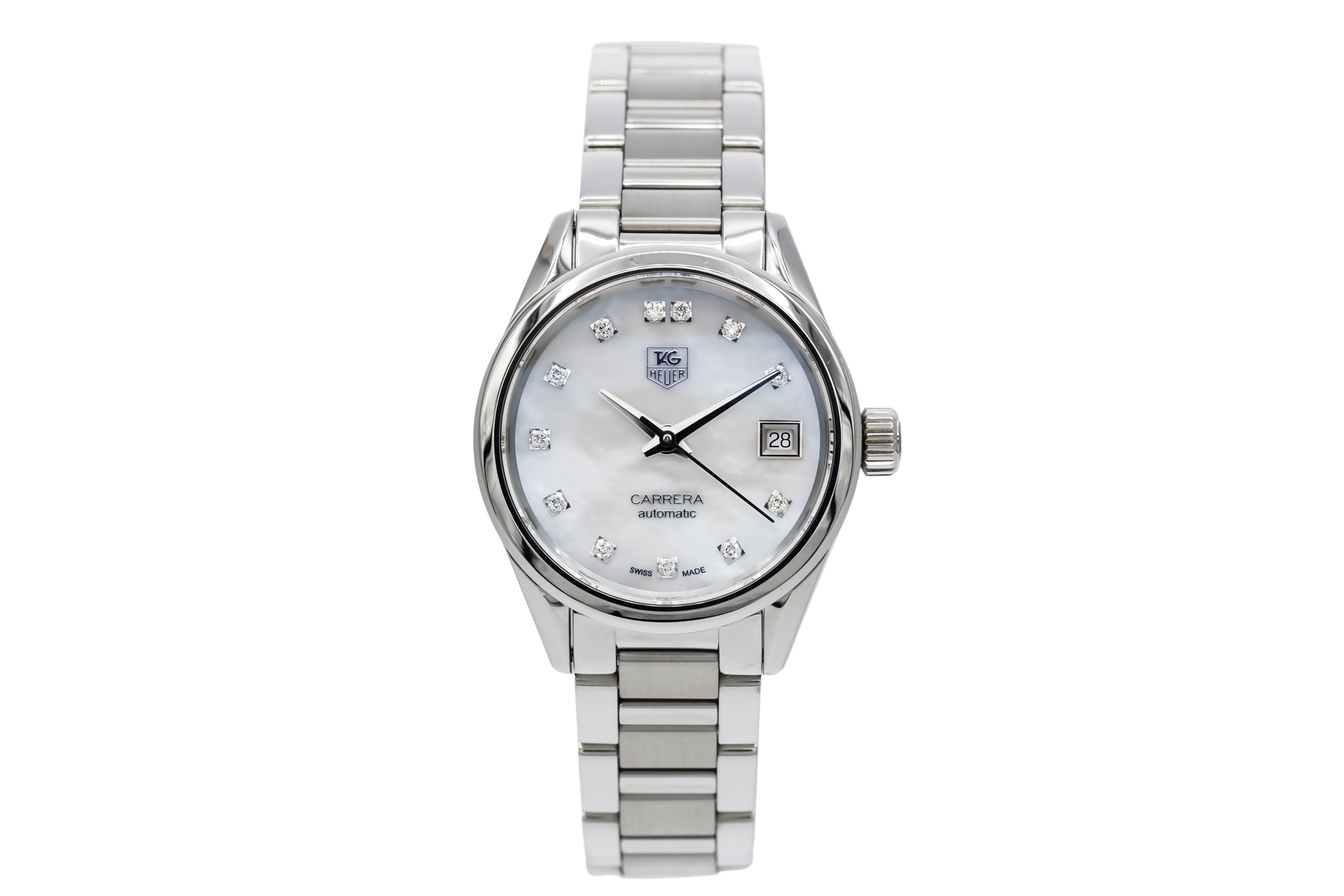This Tag Heuer Carrera Ladies WAR2414.BA0776 has a mother of pearl white - diamond dial and a bracelet strap. This Tag Heuer has undergone a thorough inspection of accuracy, functionality and condition at our Tag Heuer certified service centre to determine the level of reconditioning required to meet our strict standards. It has also been checked against our records to ensure authenticity. All our watches have a 24-month warranty for your peace of mind.