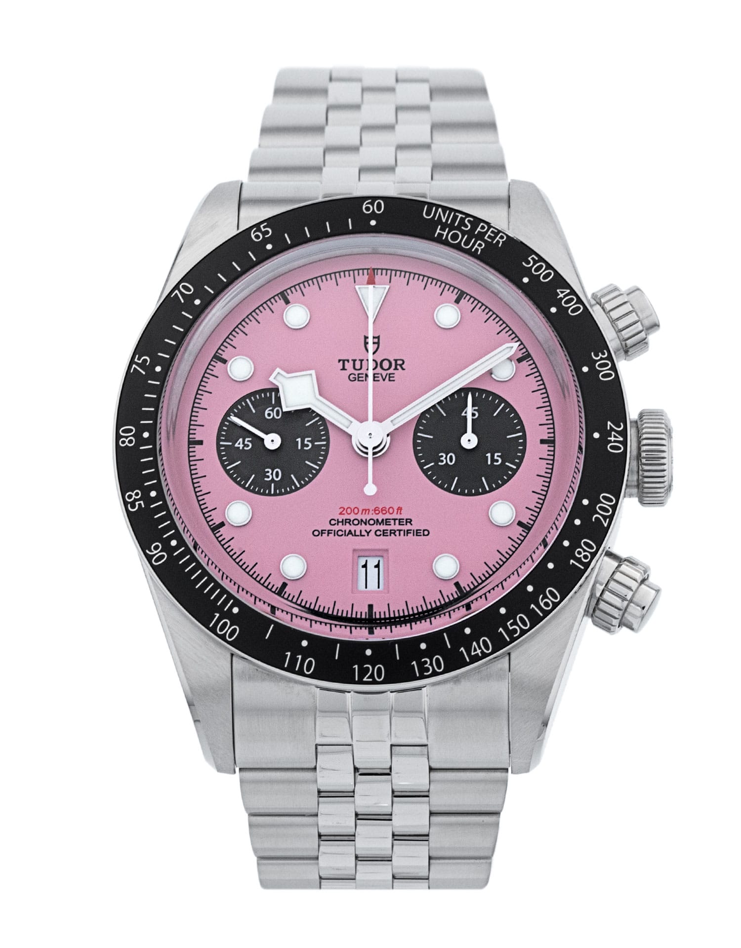 This Tudor Black Bay Chrono M79360N-0019 has a pink dial and a bracelet strap. This Tudor has undergone a thorough inspection of water resistance, accuracy, functionality and condition to determine the level of reconditioning required to meet our strict standards. It has also been referenced against technical documents and manufacturer records where available to ensure authenticity and a clean history. Our watches have a 24-month warranty for your peace of mind, in conjunction with any remaining manufacturer’s warranty from new or from service. To maintain the manufacturer’s warranty on this watch, it has not been polished in our service centre.